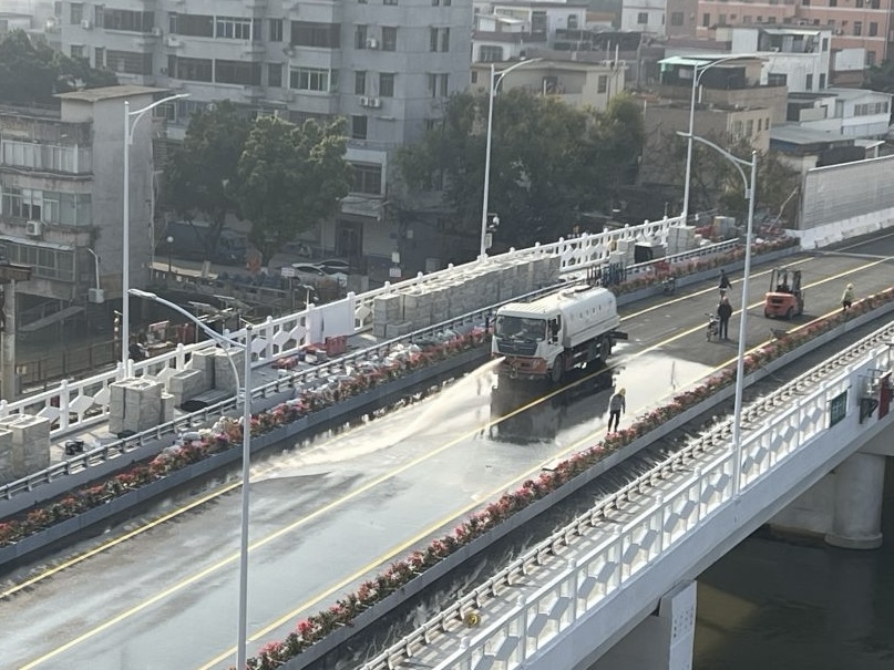 与旧桥相比,新桥有多处显著提升:主桥拓宽9.8米并增设人行道,跨径增大后提升了南堤路与长堤路的通行净空,桥梁长度较旧桥缩短43.8米;四个人行梯道同步拓宽,两侧加装降噪隔声屏障;主桥机动车道与人行道用花槽分隔,摆放134盆共402棵簕杜鹃,颜值大幅提升。此外,大桥南北岸还配套建设了两个微型公园,景观亮化工程包含桥底投光灯与LED洗墙灯。